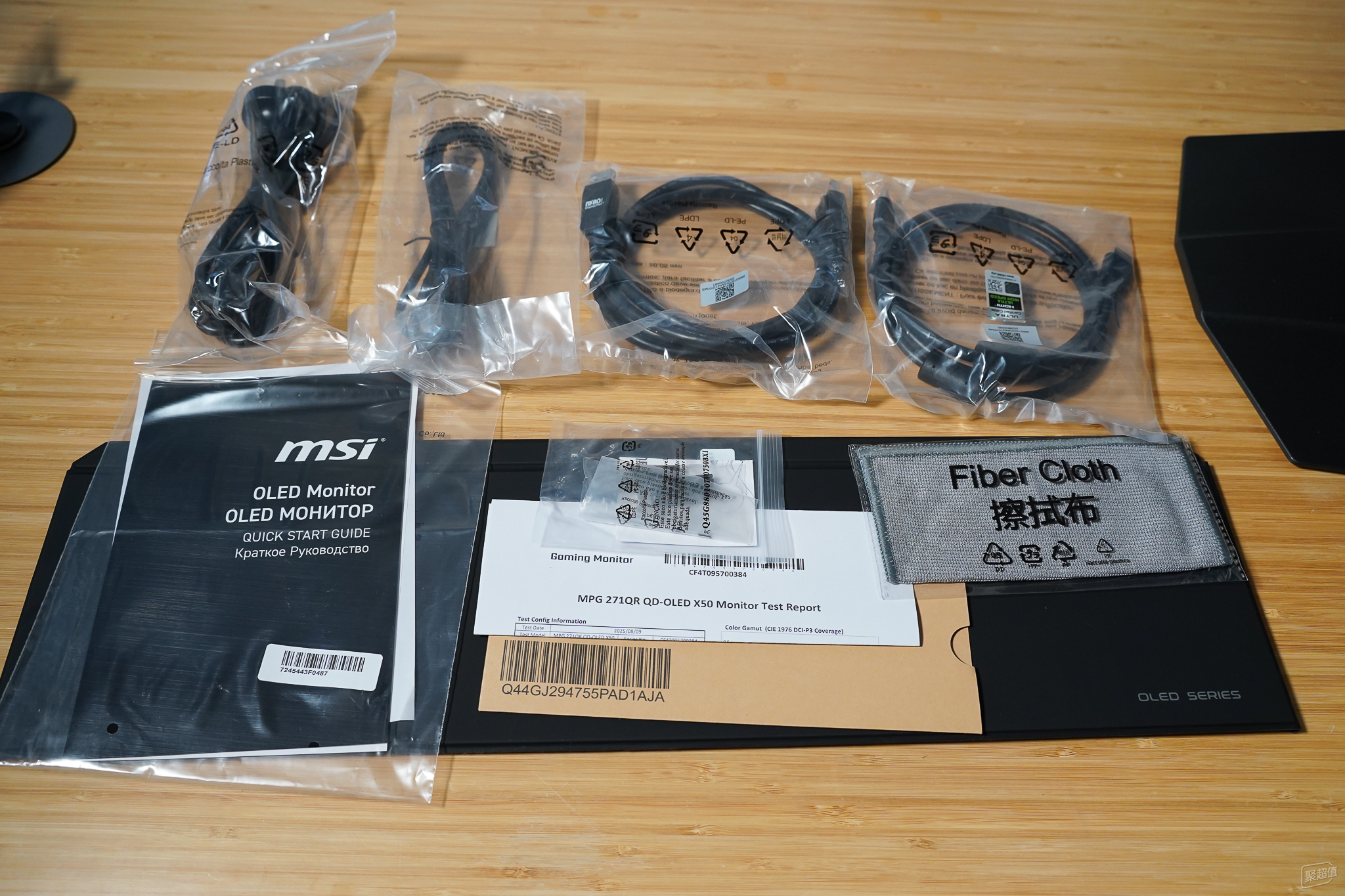 配件很多,有出廠檢驗(yàn)報(bào)告、屏幕擦拭布,防止用戶用不當(dāng)?shù)牟牧喜潦迷斐善聊粨p傷。黑色的一條是磁吸遮光罩。四根線分別是電源線、USB B型接口線(用于連接計(jì)算機(jī)和顯示器),一根DP線和一根HDMI線。