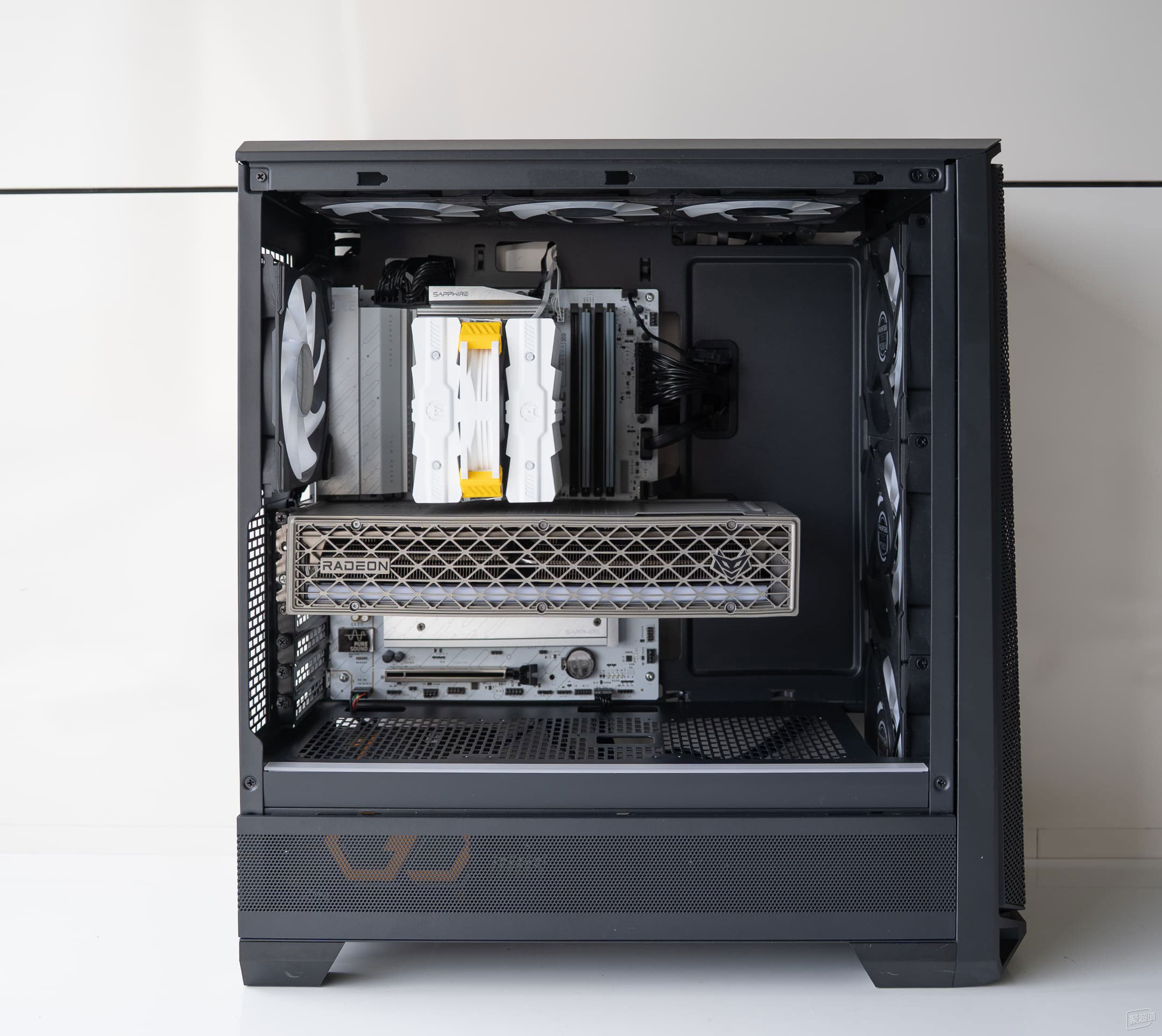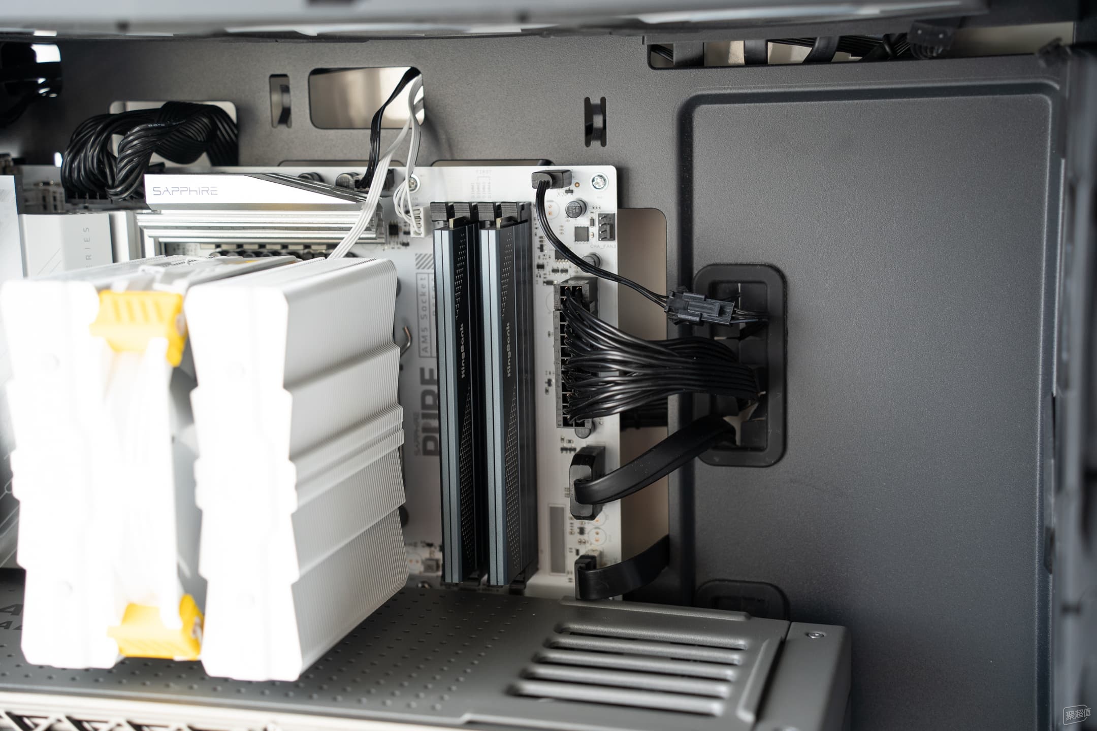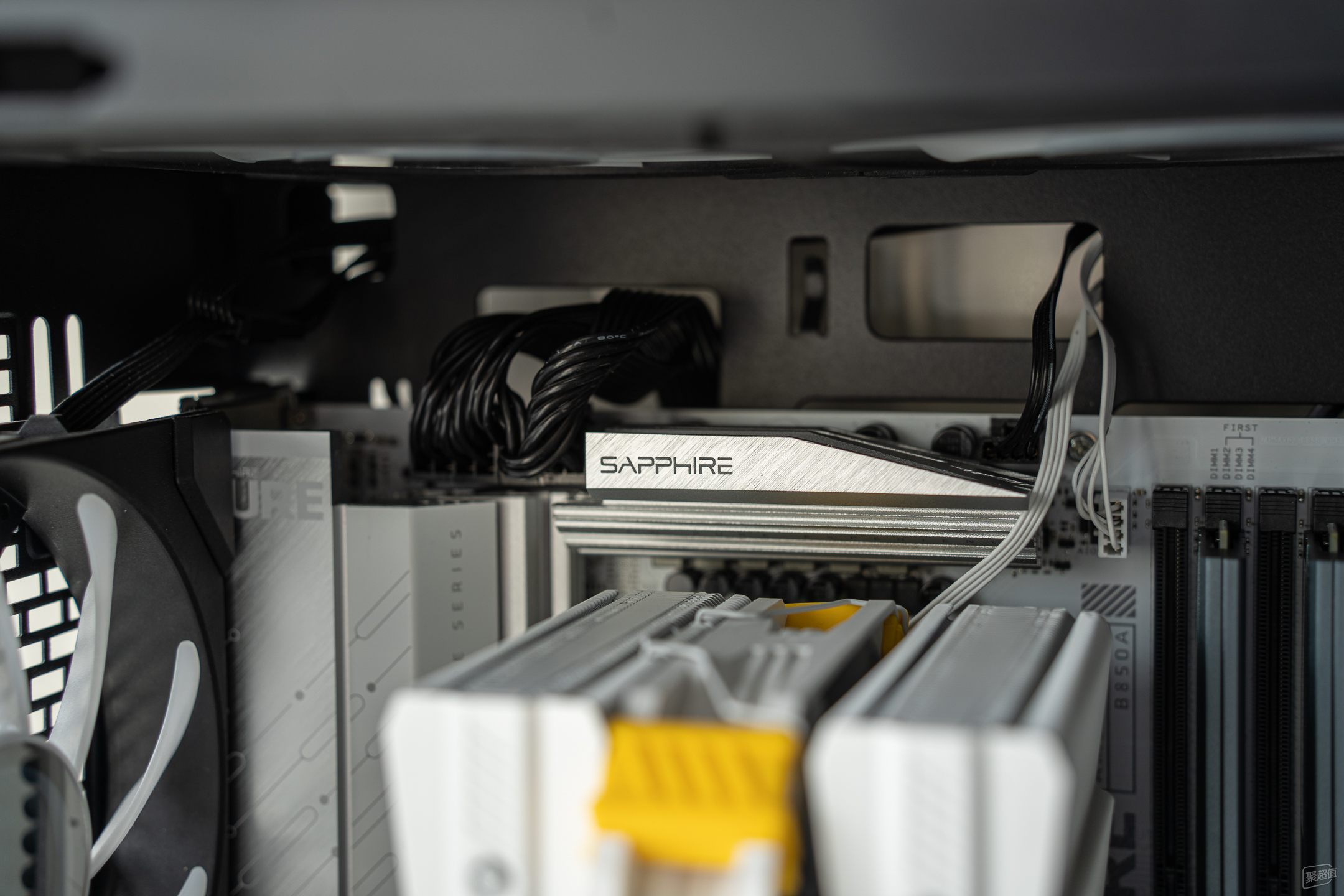 顯卡方面,我依然選擇的藍寶石家的顯卡,這次選用的是藍寶石 9070XT氮動,它基于AMD RDNA 4架構,GPU代號 Navi 48,擁有4096 個流處理器、64個光線追蹤加速器以及128個AI加速器。游戲頻率達 2520MHz,加速頻率為 3060MHz,搭配16GB 256Bit 位寬的 GDDR6 顯存,顯存帶寬 644.6GB/s 。應對這幾年的3A大作完全沒有問題。藍寶石單獨為這款顯卡增加了一個理線的位置,可以將供電線纜放入其中,之后用磁吸的頂蓋蓋上,將全部線纜隱藏起來,更加美觀。