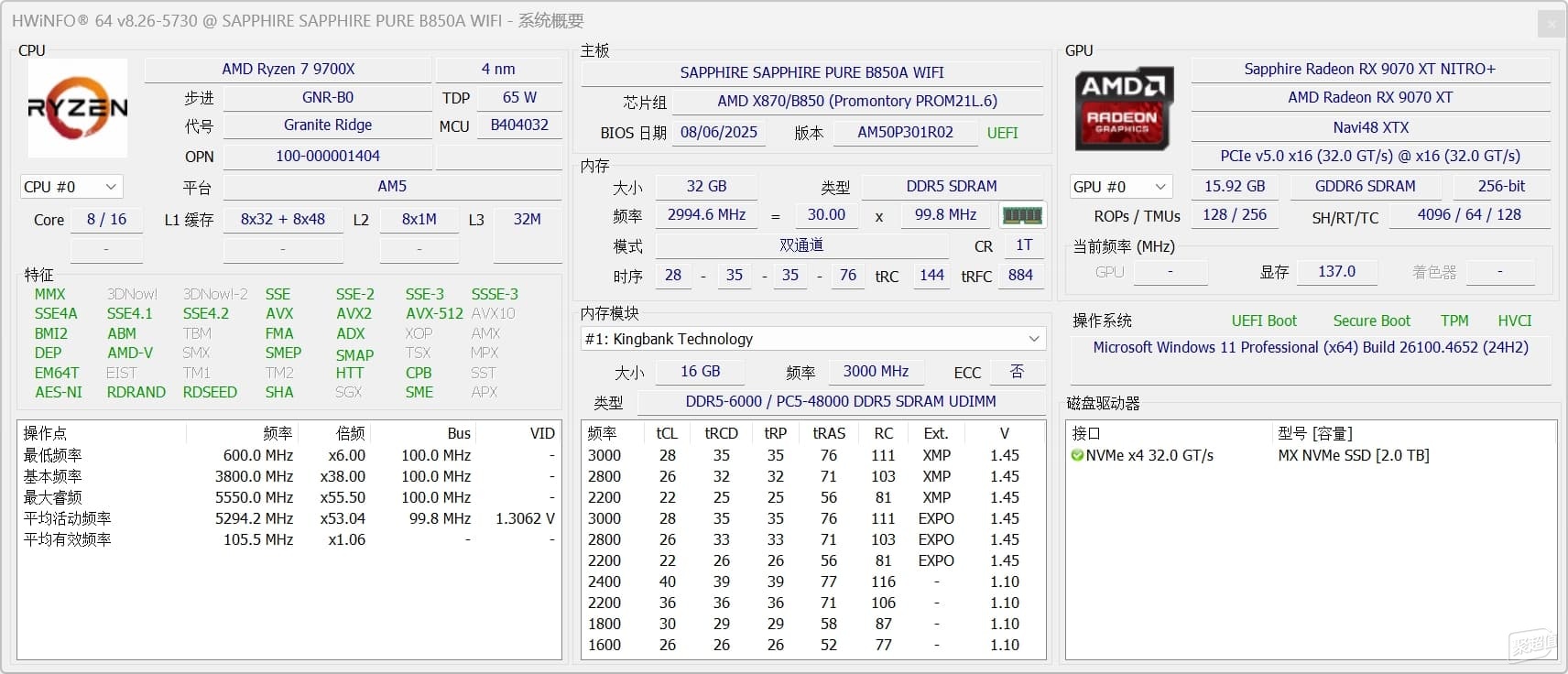 藍寶石極地 B850A WIFI 主板全面兼容銳龍 7000\8000\9000 全系處理器,對于AMD R9 9950X、9950 X3D銳龍等旗艦級處理器,也可以完全正常運行。主板搭配 12+2+1 智能供電系統,可確保這些旗艦處理器的性能滿血釋放,隨時隨地讓主機處于穩定的工況下運行。 我使用的是AMD R7 9700X 處理器時,對于這顆非旗艦級的處理器藍寶石極地 B850A WIFI 更是可以輕松應對,在實際使用中,無論是日常多任務處理、高畫質游戲的運行,主機都可以穩定運行,沒有任何不兼容或散熱不足的問題出現。