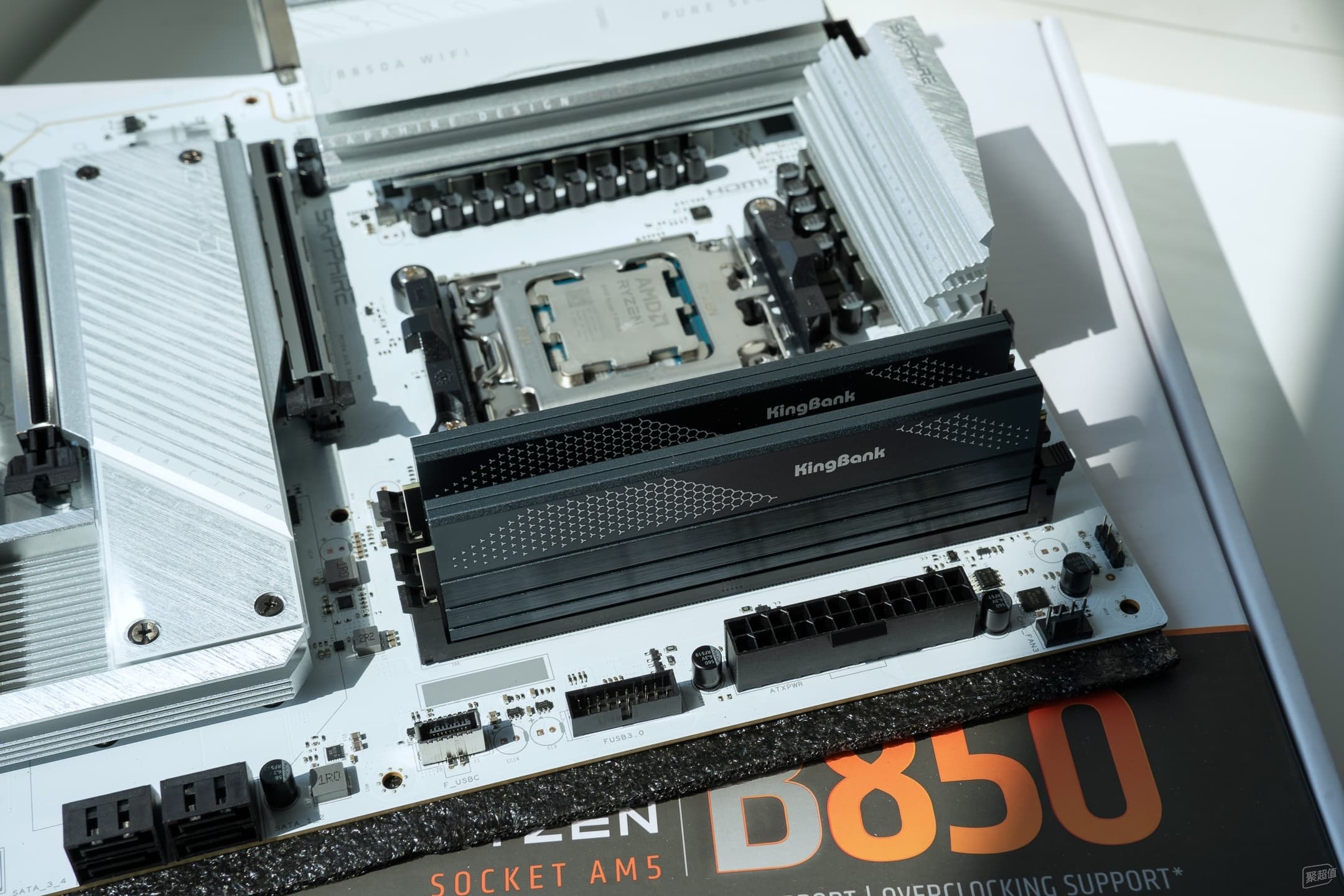內存方面,我選用的是金百達星刃黑色 16G * 2 的套裝版本。這是一款采用海力士 A-die 顆粒的 DDR5 內存,時序為 C28。最高功率為 6000MHz,自帶 On-die ECC 除錯機制,同時支持 AMD EXPO 以及 Intel XMP 3.0 的超頻技術。搭配藍寶石極地 B850A WIFI 非常合適。 作為游戲黨來說,32G 的內存就完全夠用了。如果進行AI計算處理等其他專業需求,也可以選擇搭配更多的內存。藍寶石極地 B850A WIFI 自帶了 4個內存插槽,可供發燒友進行內存的加裝升級。