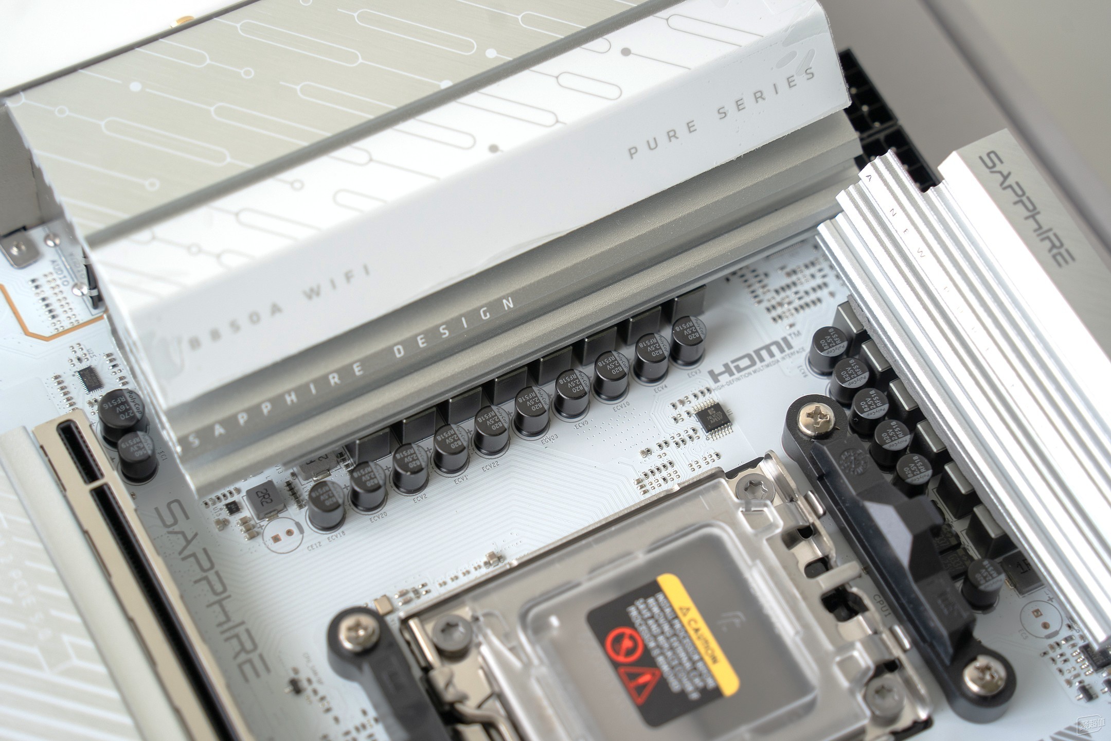 在散熱設計上,藍寶石極地 B850A WIFI,配備高效大面積鋁制散熱裝甲,采用熱傳導效率高的鋁制材質作為基礎,搭配裝甲表面的細微紋理設計,可進一步擴大散熱面積,提供了穩定的冷卻效果。像 AMD R9 9950X、9950 X3D 等高端 CPU 運行時產生的熱量,也能完全壓制,為硬件提供穩定的運行環境。
