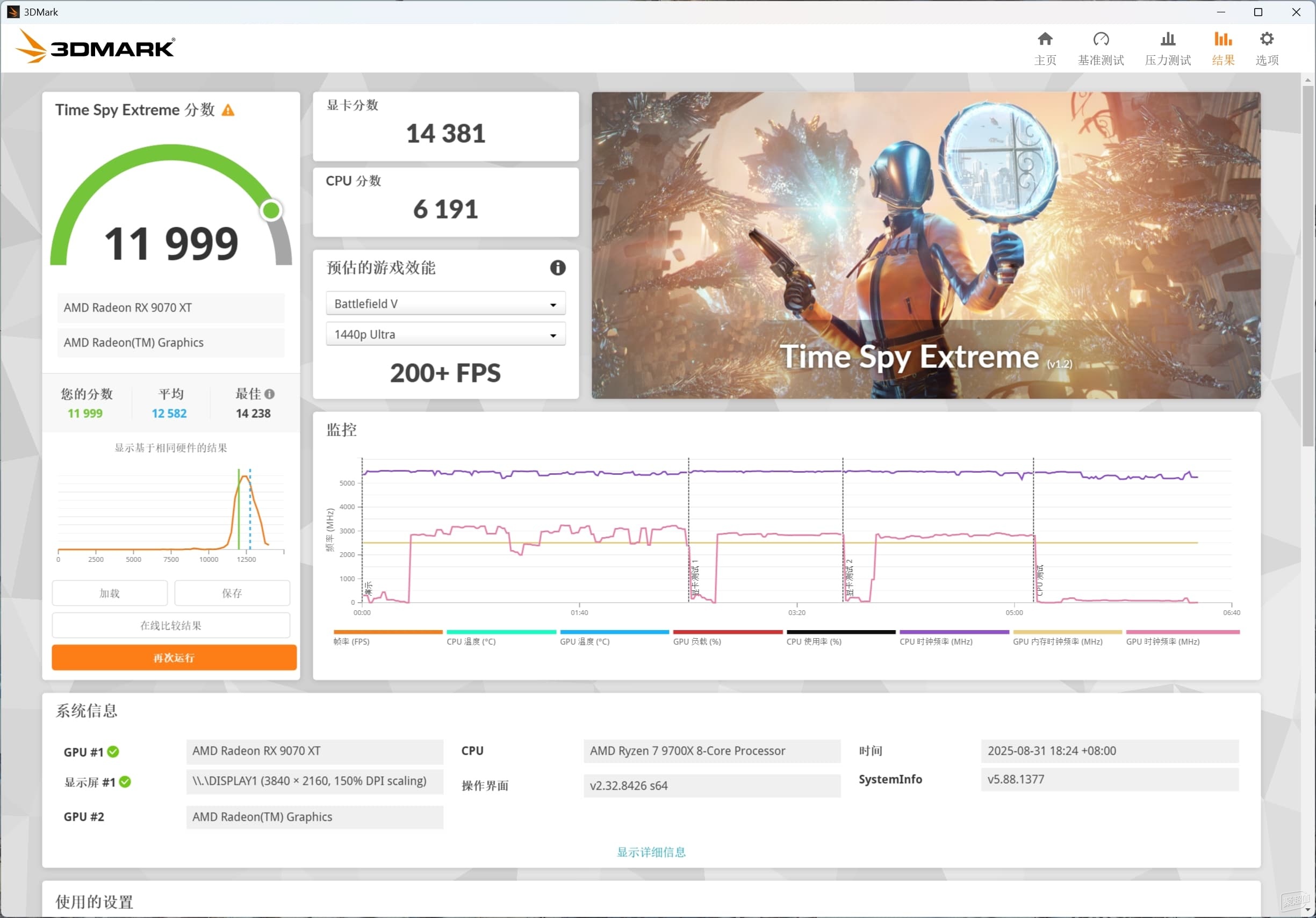 使用 3DMark 中的 TimeSpyExtreme 進行性能測試,該場景專為評估硬件在高負載、高分辨率下的游戲及圖形處理能力設計,經過完整測試流程,主機最終取得 11999分的成績,這樣的分數非常高,可以保證主機對 3A游戲大作以及視頻創作類的工作完美運行。