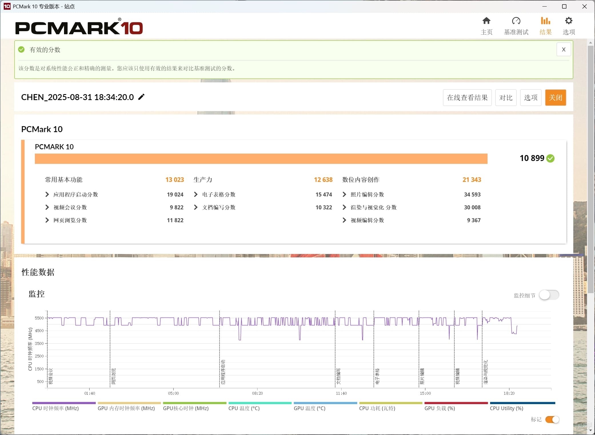 接下來使用 PCMark 對主機整體性能的基準測試軟件,主要衡量系統在日常辦公、生產力以及內容創作等多種辦公場景下的表現,最終得分為 10899分,在辦公的綜合性能也方面表現出色。
