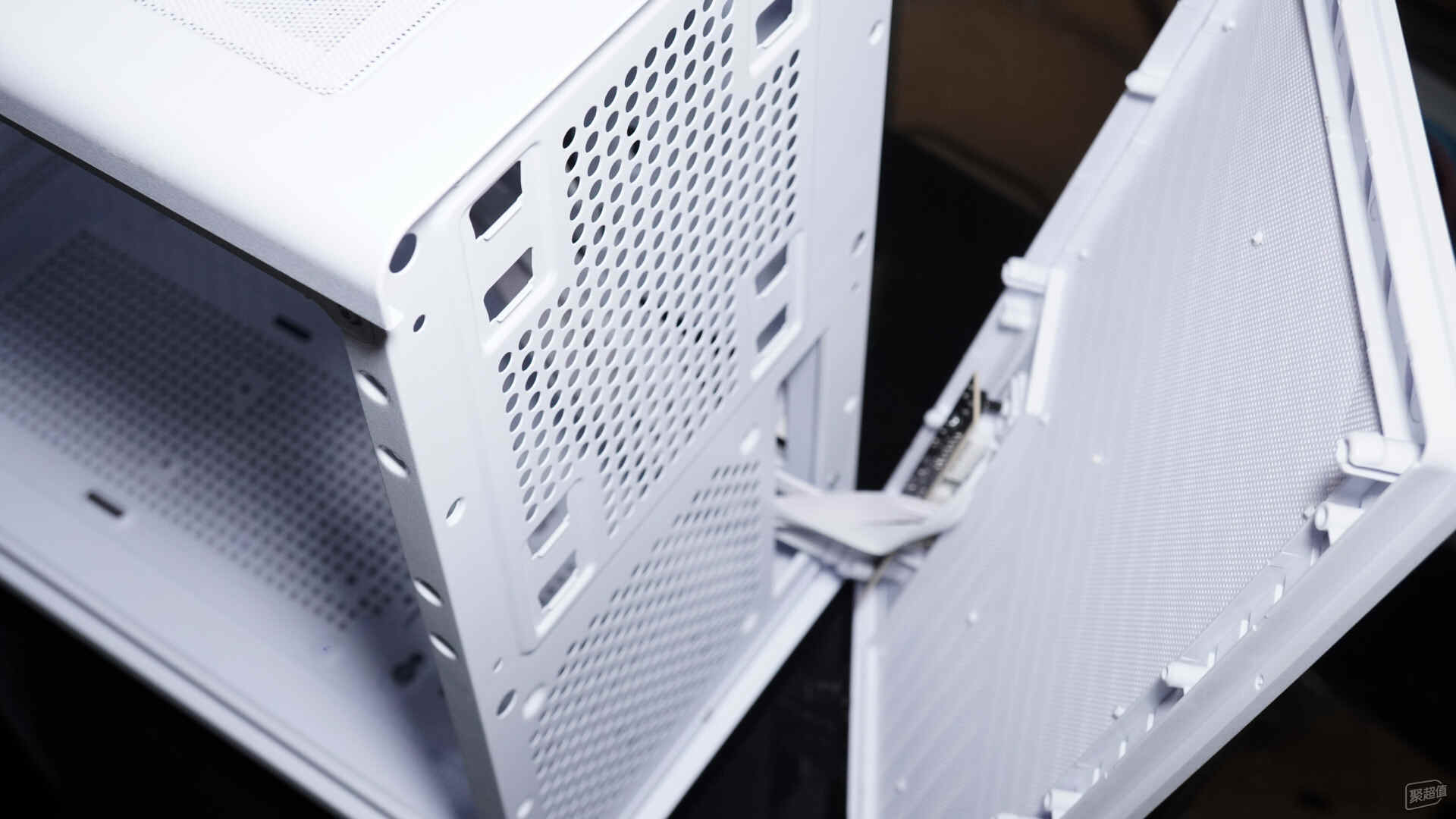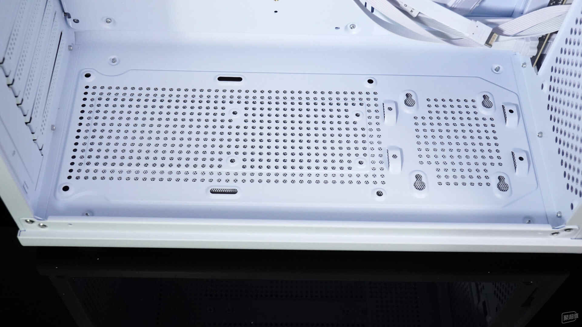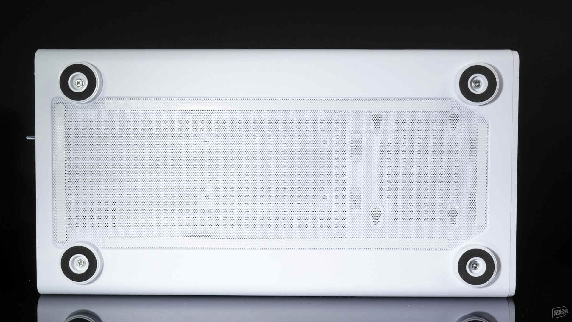 底面整片的通風(fēng)孔,散熱余量做得相當(dāng)充足,一整片的磁吸防塵網(wǎng),清理起來也很方便。底部最極限的情況,就是M-ATX主板插滿,第二個(gè)PCIe槽位上擴(kuò)展卡,大不了把下面的風(fēng)扇換成薄扇。