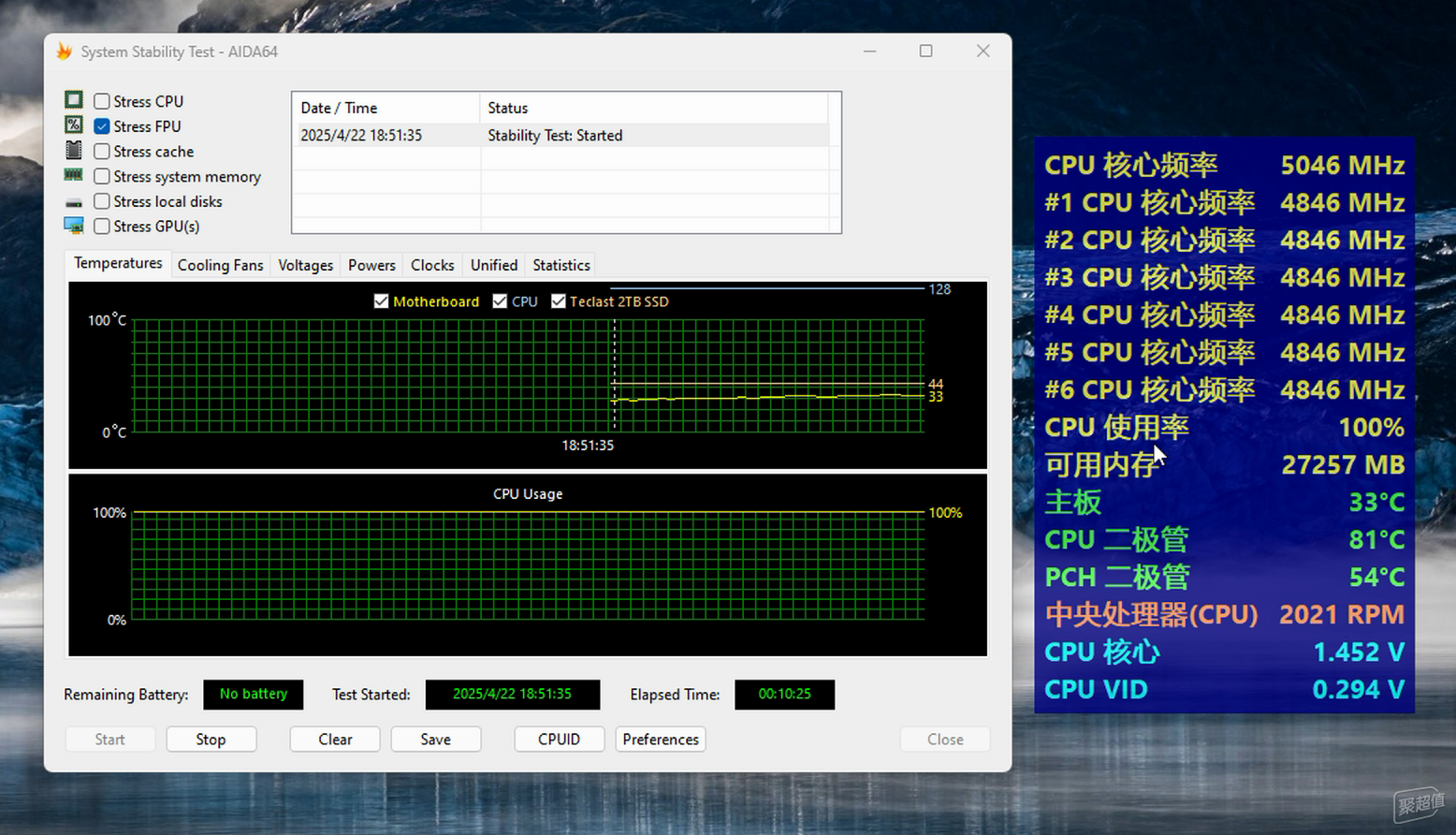 跑一下AIDA64烤機(jī),防潮箱顯示室溫28.3度僅供參考。主板默認(rèn)BIOS未做任何設(shè)置,7500F壓在81度左右浮動。