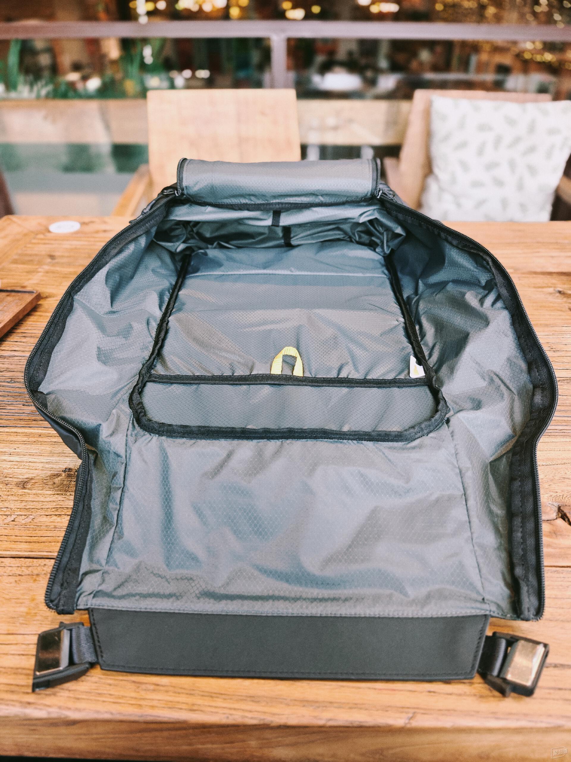 拉開兩側的拉鏈就能將整個前側全部掀開,就像是敞開的行李箱一樣,能夠從容的整理各種物品,比如疊好的衣物等,擺放起來十分輕松,出去旅行或者帶的東西比較多的時候更能體會到這樣的便利性,巨大的空間足以應對兩三天的短途出行需求了。