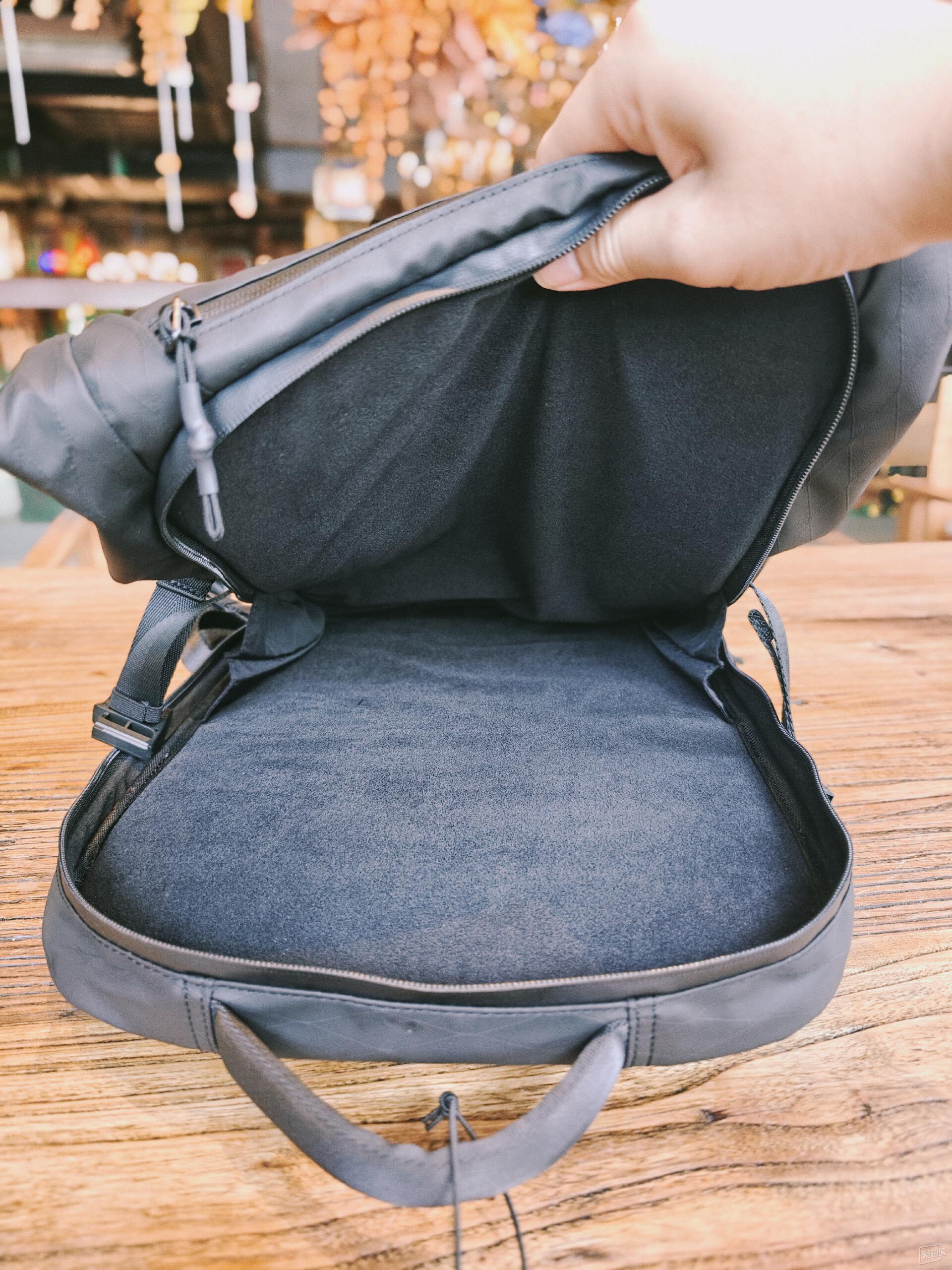 主倉后部還有一個單獨的分隔層,兩側采用的是絨面材質,帶來了較好的防護效果,更適合作為電腦倉使用,可以輕松放入一個17寸的筆記本電腦,放一些pad一類的自然更不在話下。