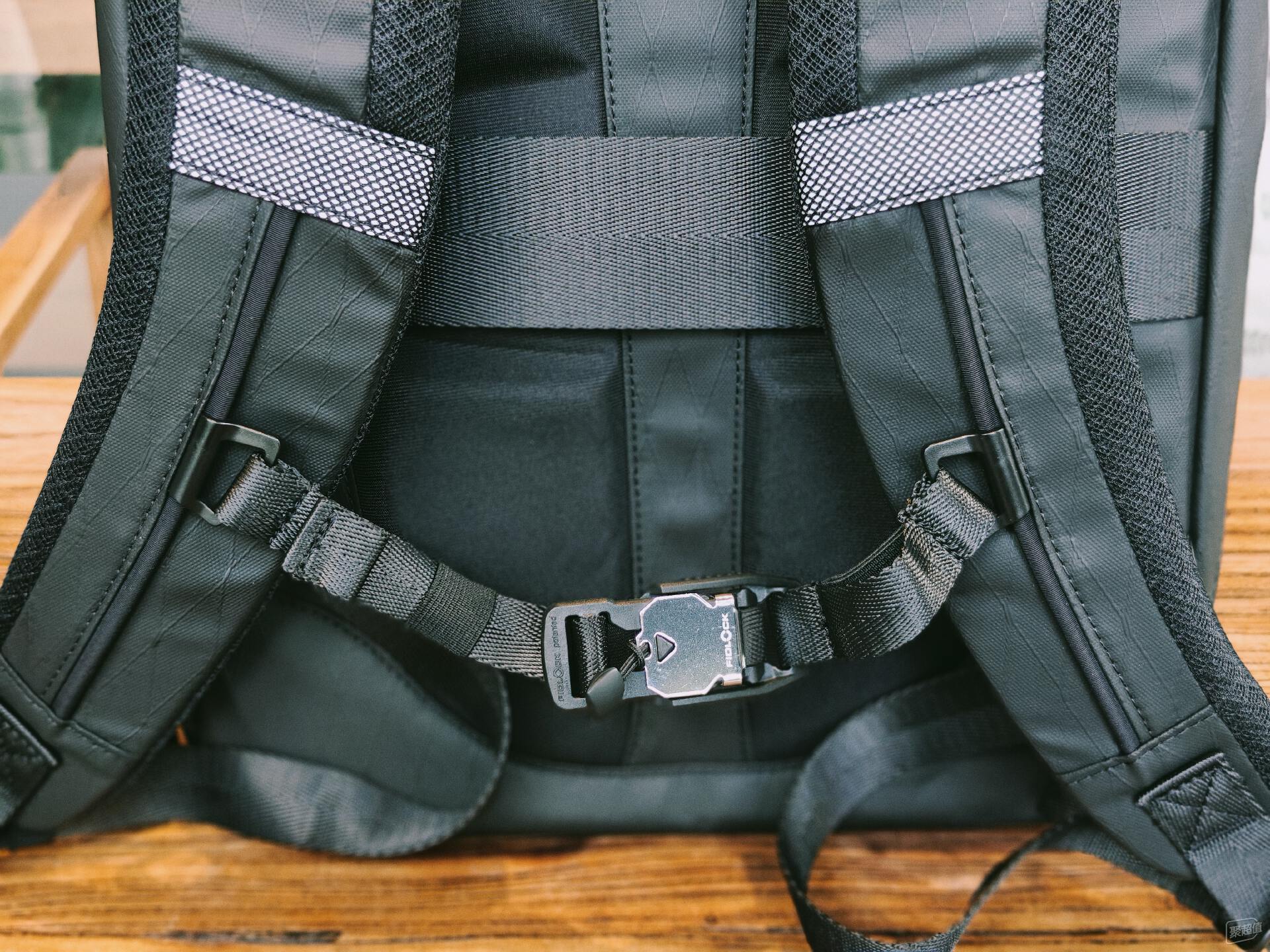 這款背包在整體的用料方面也是非常到位的,除了采用了戶外級SPU防潑水涂層面料,以應對戶外多變環境和方便打理以外,甚至定制的YKK拉鏈都有著防潑水涂層,開合絲滑還防水。頂部用來固定上蓋的兩側鎖扣和胸帶的固定鎖扣則全都采用了德國的FIDLOCK磁吸扣具,玩戶外或者軍事的肯定都很熟悉,也都知道這看著不起眼的磁吸扣具價格多么感人……