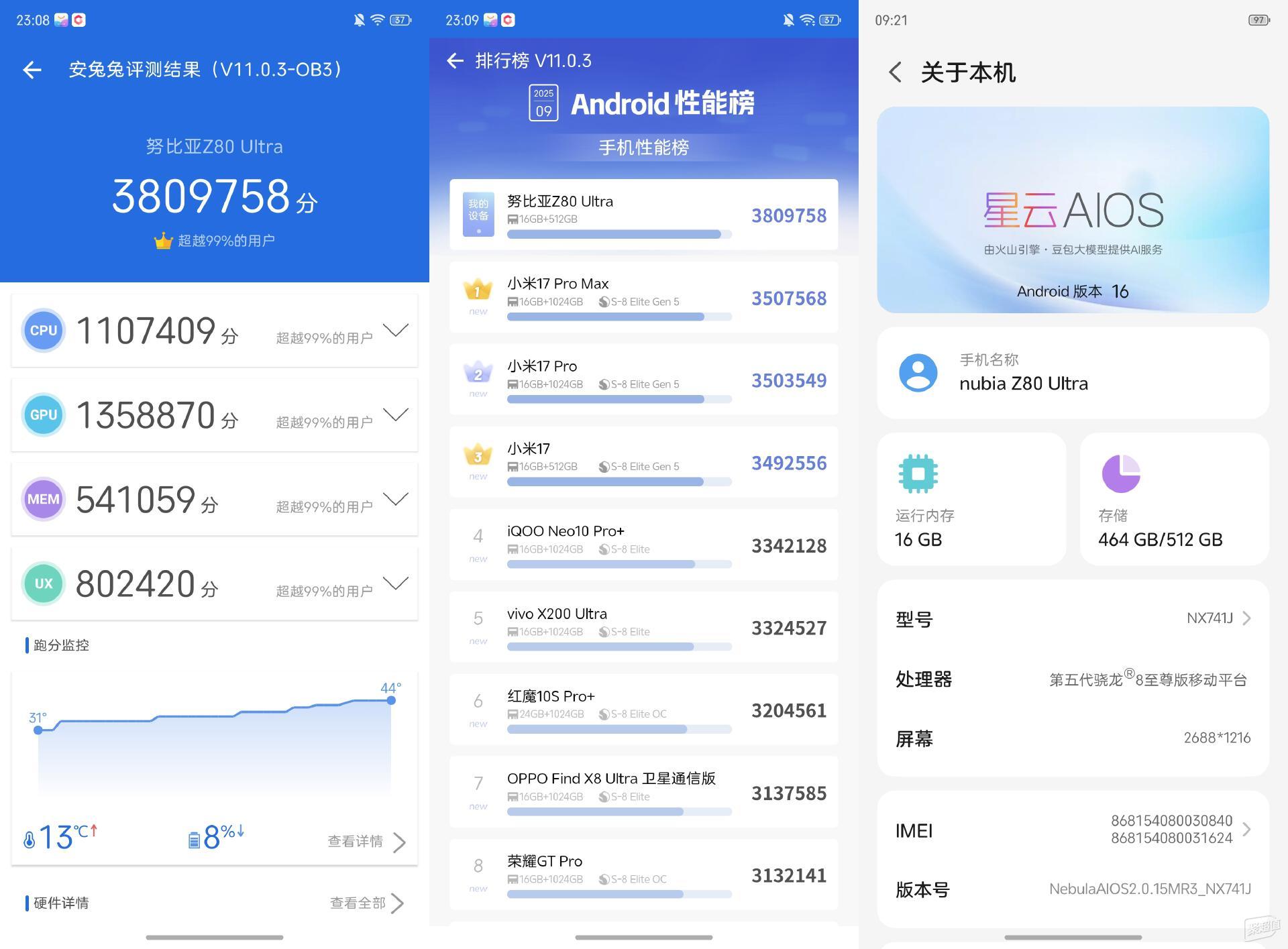 努比亞Z80 Ultra的性能配置也是top級別,搭載了第五代驍龍8至尊版處理器,配合滿血版LPDDR5X內存+UFS 4.1存儲組合,最高支持16GB+1TB的存儲方案。在安兔兔評測中我隨便跑跑就超過了380萬分,而且可以明顯看出在整個高負載測試過程中,機身溫度控制表現也很出色,有力印證了其卓越的散熱設計與強悍的性能釋放能力。