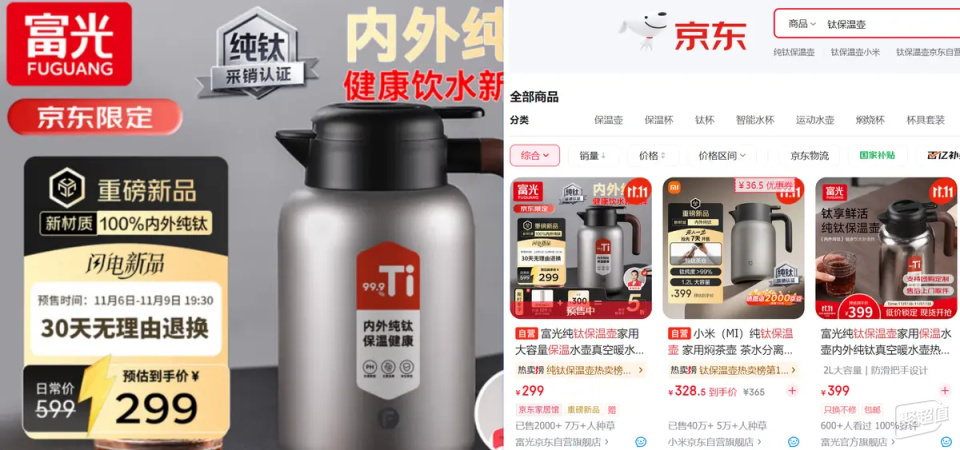 以京東電商平臺為例,知名品牌富光就把自家鈦壺直降了300塊:原價是599,一開始先降兩百到399,后來又搞雙11的限時預售,到手價299元。