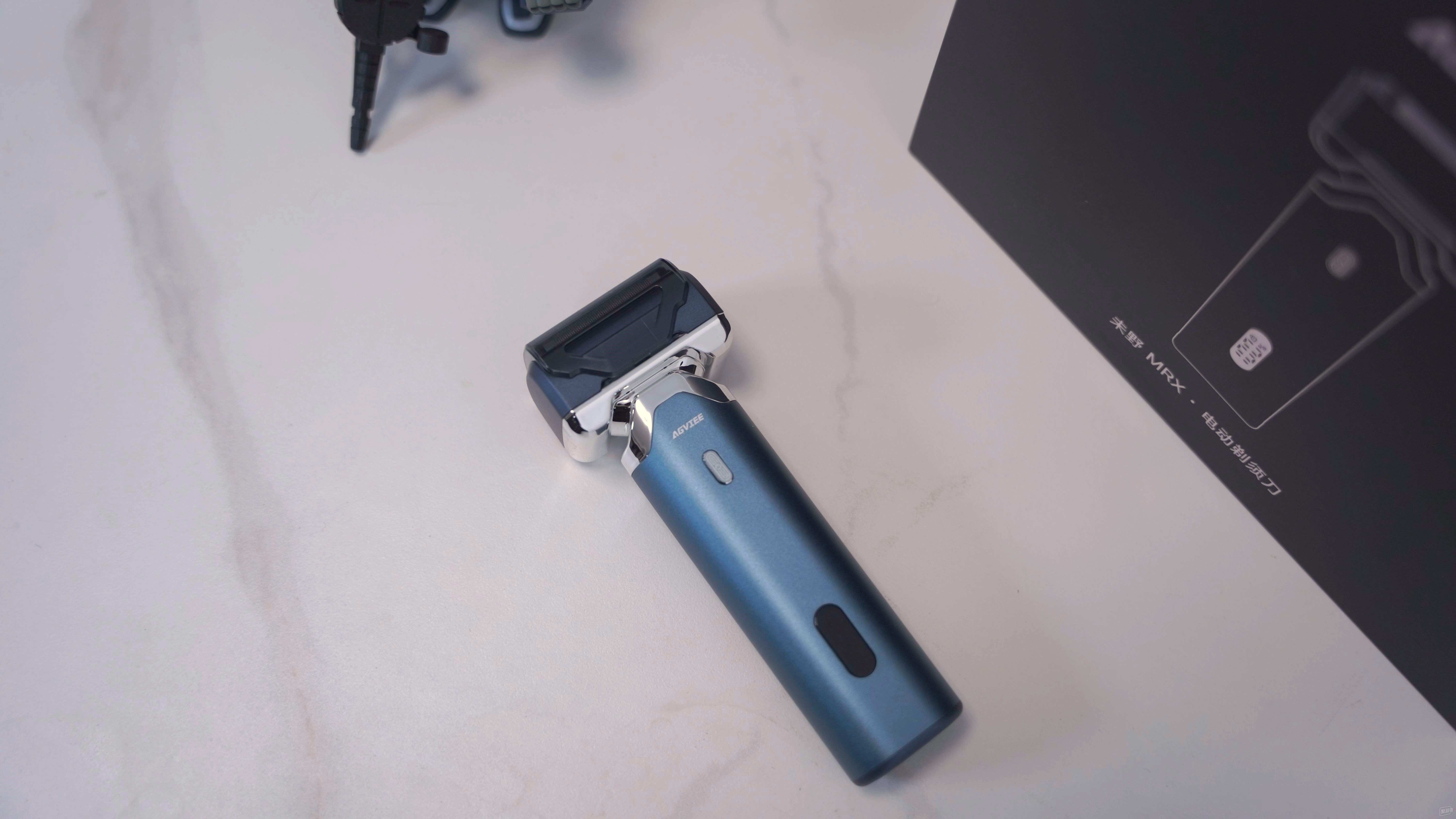 百元級的剃須刀往往都是使用了大面積的塑料配件,而未野MRX則采用全鋁機身,藍色磨砂漆面,不但耐指紋,也有很棒的握感,濕剃不易打滑。到頭過度處有鍍鉻裝飾點綴,整體顏值很高,讓人看著完全不像是百元級的產(chǎn)品。