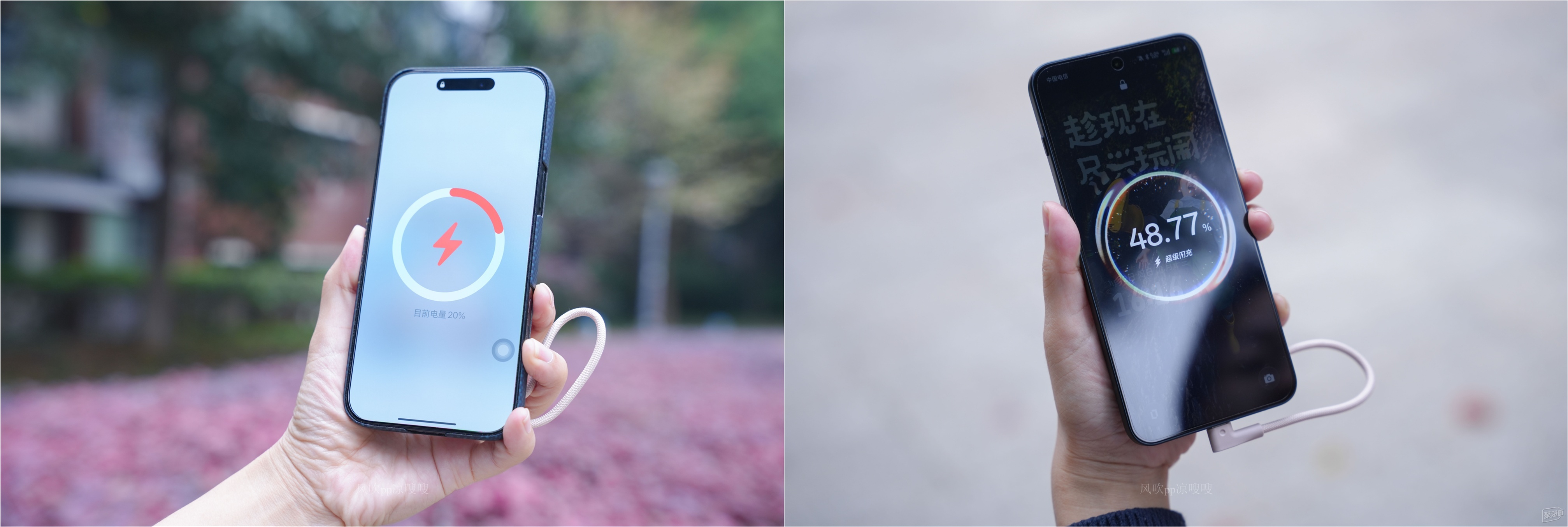 充電性能也很能打,支持15W 磁吸無線充,iPhone用戶貼上去就能閃充,USB-C快充線支持 PD 45W快充,安卓黨插線也能快速回血。實測給iPhone 16pm充電,30分鐘能充到快60%,這速度應急完全夠用,10000mAh大容量也足夠給我的iPhone回血兩次;給一加Ace 6充電同樣可以激活超級閃充。磁吸模式還兼容Apple Watch,一貼即充。這樣出門不必再單獨攜帶手表充電器,既簡化了行裝,也省去了一筆額外的開銷,可以說入手這個能讓蘋果生態的體驗更無縫。
