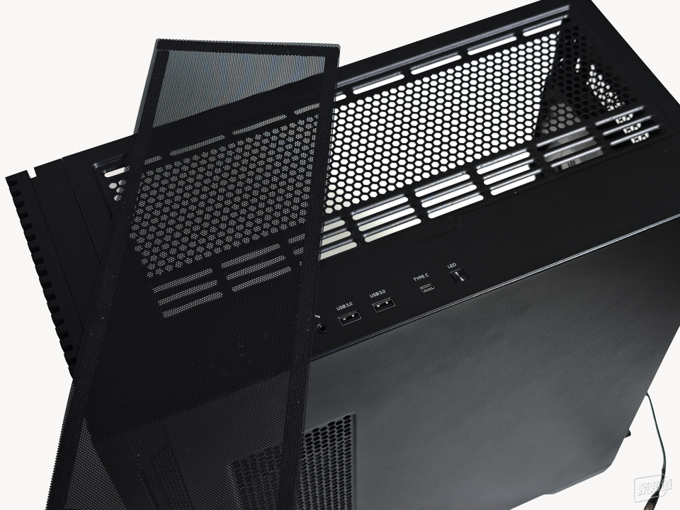 機箱頂部有蜂巢狀的出風孔,并且配備了磁吸防塵網,輕輕用力就可以快速取下防塵網,裝水冷或風扇時更加方便。機箱側面也有帶磁吸防塵網的出風孔,在保證散熱效果的同時可以有效避免粉塵進入機箱。