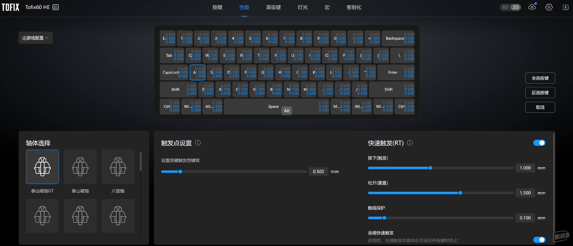 ▲另外要提一下,在最新固件里,能被單獨識別為“泰山磁軸GT”選項,可調范圍0.1–3.8 mm,觸發、松開、觸底保護、連按等都可以進行設置。