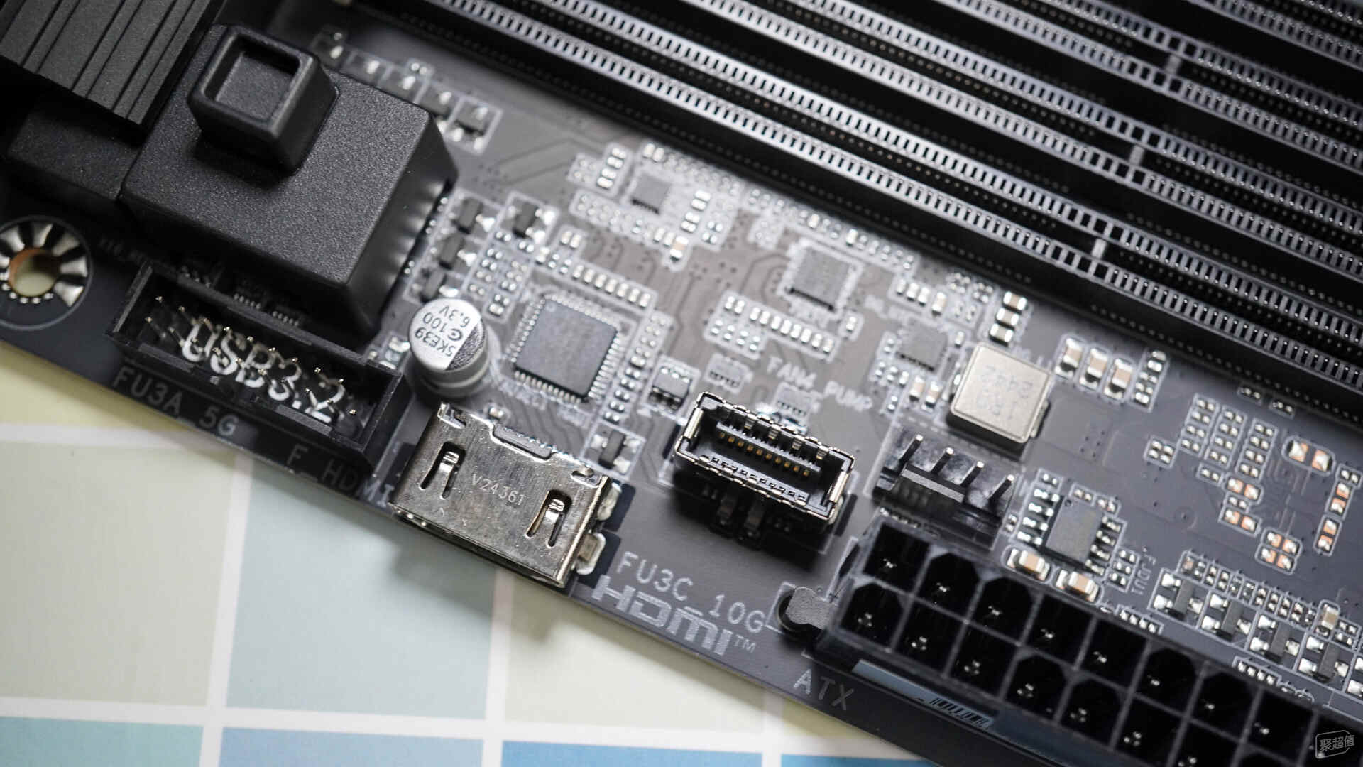 技嘉 電競雕B860M AORUS PRO WIFI7的一個獨特設計,是將一個HDMI視頻輸出接口做在了板子右側,方便現在越來越流行的機箱副屏連接。旁邊還安排了1個機箱風扇接針,USB 3.2前置接口,以及10Gbps帶寬的機箱前置Type-C擴展插槽。