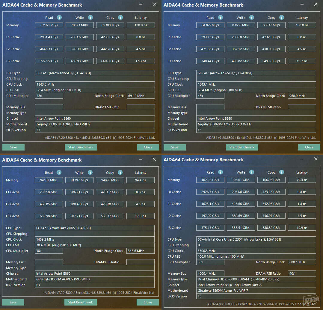 簡單整理一下默頻關閉黑科技,默頻開啟黑科技,XMP關閉黑科技,XMP開啟黑科技下的帶寬和延遲表現。在XMP和黑科技同時開啟的情況下,內存的讀寫拷貝速度來到了102.22GB/s,103.61GB/s,106.98GB/s,延遲壓到了79.4ns,而這一切只需要BIOS里勾選兩三個選項,幾秒鐘的事情。