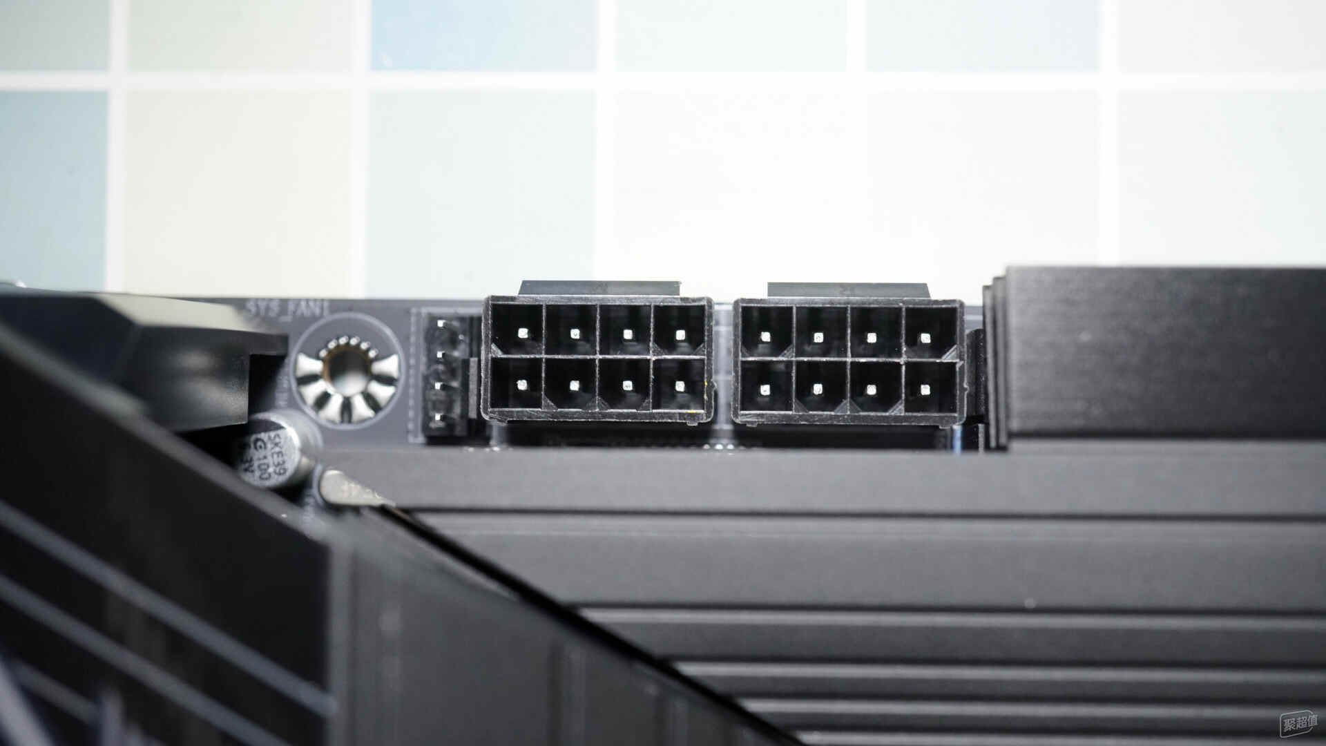左上角是2個8Pin的CPU供電,Ultra 200這一代的能耗比相當高,這個供電拉個Ultra 7都有很足夠的冗余了。旁邊還藏了一個系統風扇接口,接上置風扇的話很方便,不用再繞線了。