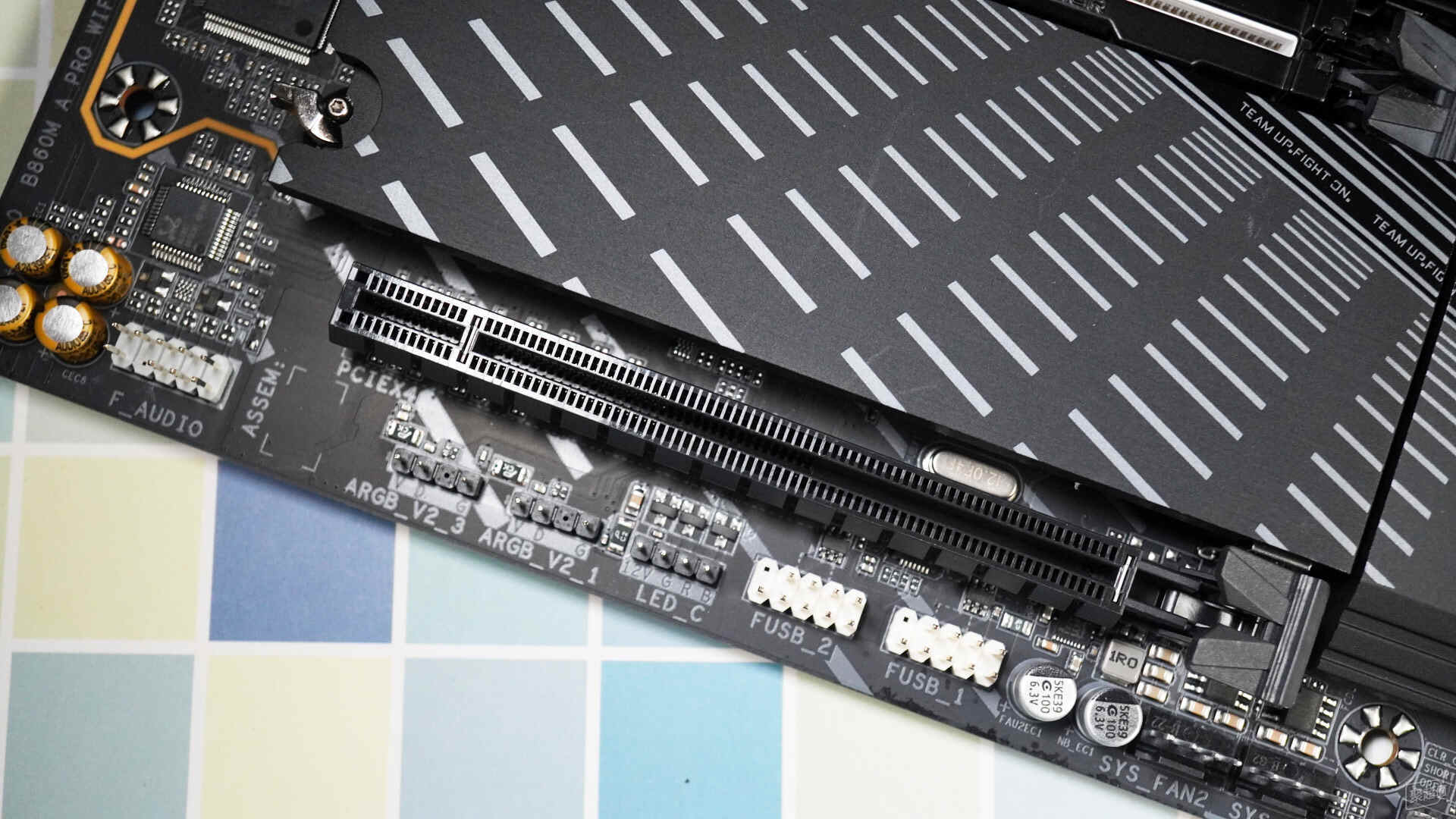 M.2硬盤位方面,顯卡上方這個是直通CPU的,PCIe5.0規格,卡扣也使用了散熱片+硬盤的一體式快拆設計,不用工具和螺絲,實在是太好了。PCIe5.0 x16的顯卡槽槽,也使用了金屬裝甲進行加固。