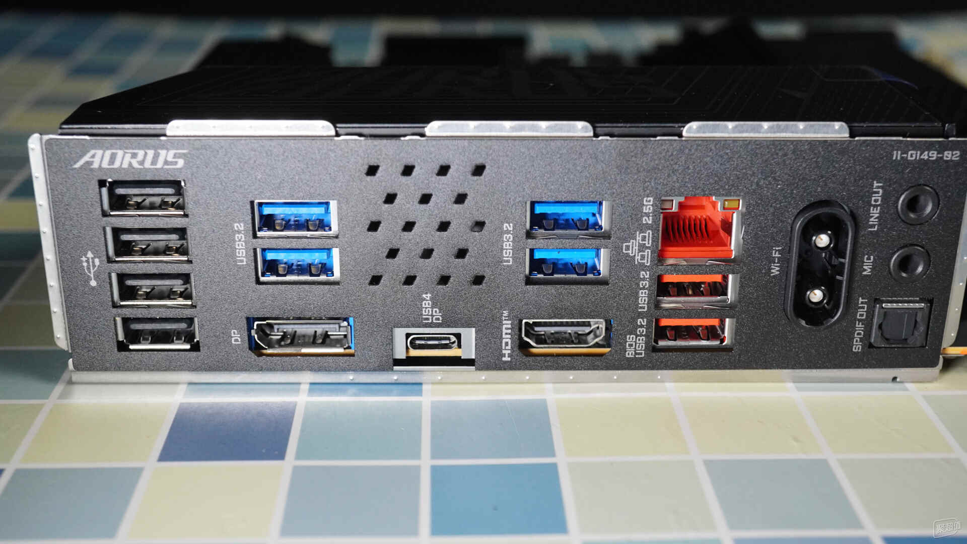 背部I/O接口方面,4個USB2.0用于接外設,2.4G接收器不容易發生干擾。4個USB 3.2 Gen1 5Gbps接口,2個USB 3.2 Gen2 10Gbps接口,以及1個多功能USB4的Type-C。這個USB4 Type-C不僅有40Gbps帶寬,而且支持DP視頻輸出,和旁邊的1個DP、1個HDMI以及前置那個HDMI,可以組成4顯輸出的強大陣容。2.5G的有線網卡,以及出廠內置的WIFI7也都很實用,WIFI天線1秒接上即可享受高速網絡。