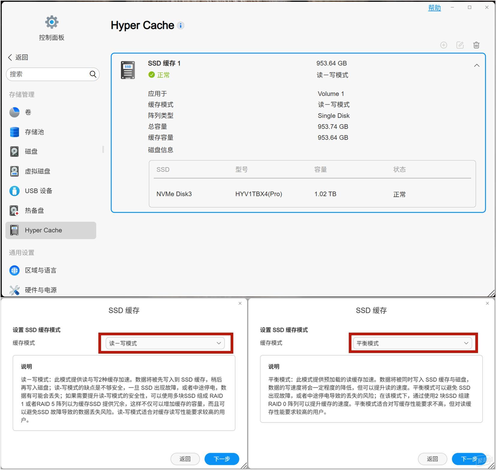 也可以2個(gè)M.2組成RAID存儲(chǔ)池,剩下的1個(gè)M.2作為機(jī)械硬盤的緩存,提升文件存取響應(yīng)速度。鐵威馬TOS6還給到SSD緩存兩種模式:讀-寫模式,數(shù)據(jù)先寫入SSD緩存,再?gòu)木彺鎸懭氪疟P,最大化發(fā)揮固態(tài)硬盤性能優(yōu)勢(shì),把任務(wù)轉(zhuǎn)至后臺(tái)縮短耗時(shí),適合對(duì)緩存讀寫性能要求高的用戶;平衡模式,數(shù)據(jù)被同步寫入SSD緩存和磁盤,以固態(tài)緩存有效抬升磁盤讀寫性能,適合對(duì)數(shù)據(jù)安全有更高要求的用戶。