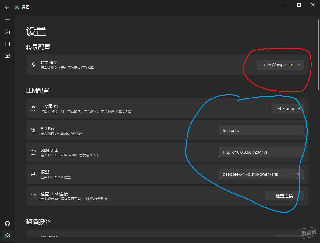 這是一款免費開源的軟件,在Github上可以找到源代碼或者安裝包,一鍵安裝運行。此處我以Windows版本為例,它的核心功能分為三塊,音視頻方面的東西自帶FFmpeg就略過了。第二塊是語音轉文字,提供了不少的提口供使用,這里推薦默認的FasterWhisper,本地幾G的模型,在線下載即可,非常方便。藍圈部分是LLM配置,用于語言大模型處理斷句,字幕優化甚至是翻譯等功能。