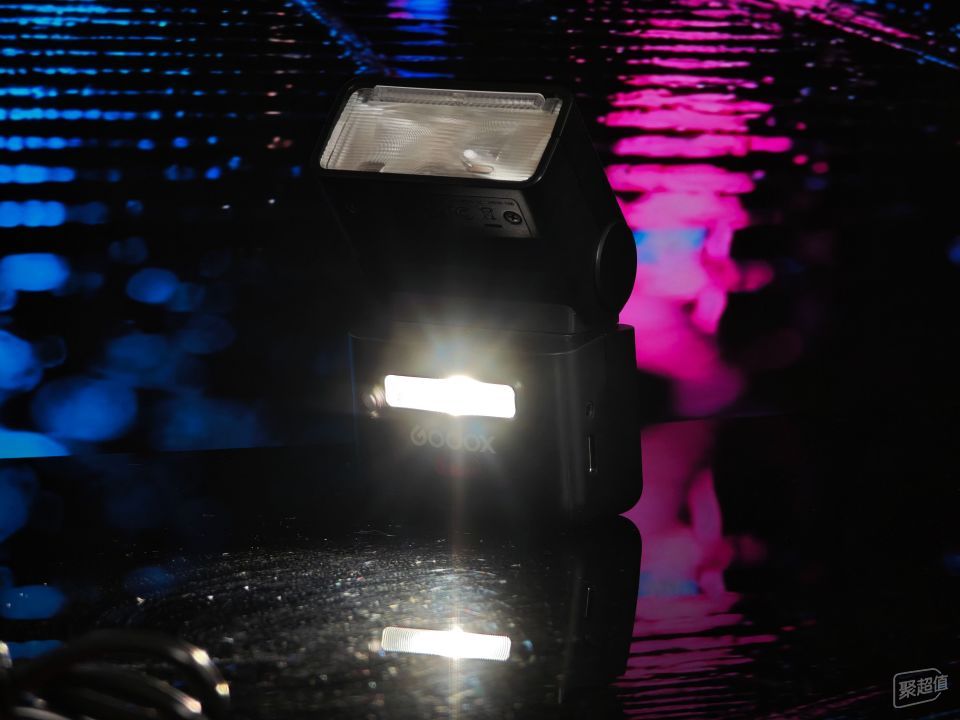 在閃光燈前方還設計了一盞LED造型燈,當在光線不好的地方,我們可以一鍵開啟造型燈,便于進行光效預覽和參數調整。同時這盞燈還可以當做視頻拍攝時的輔助移動補光燈,一燈雙用真的不錯。